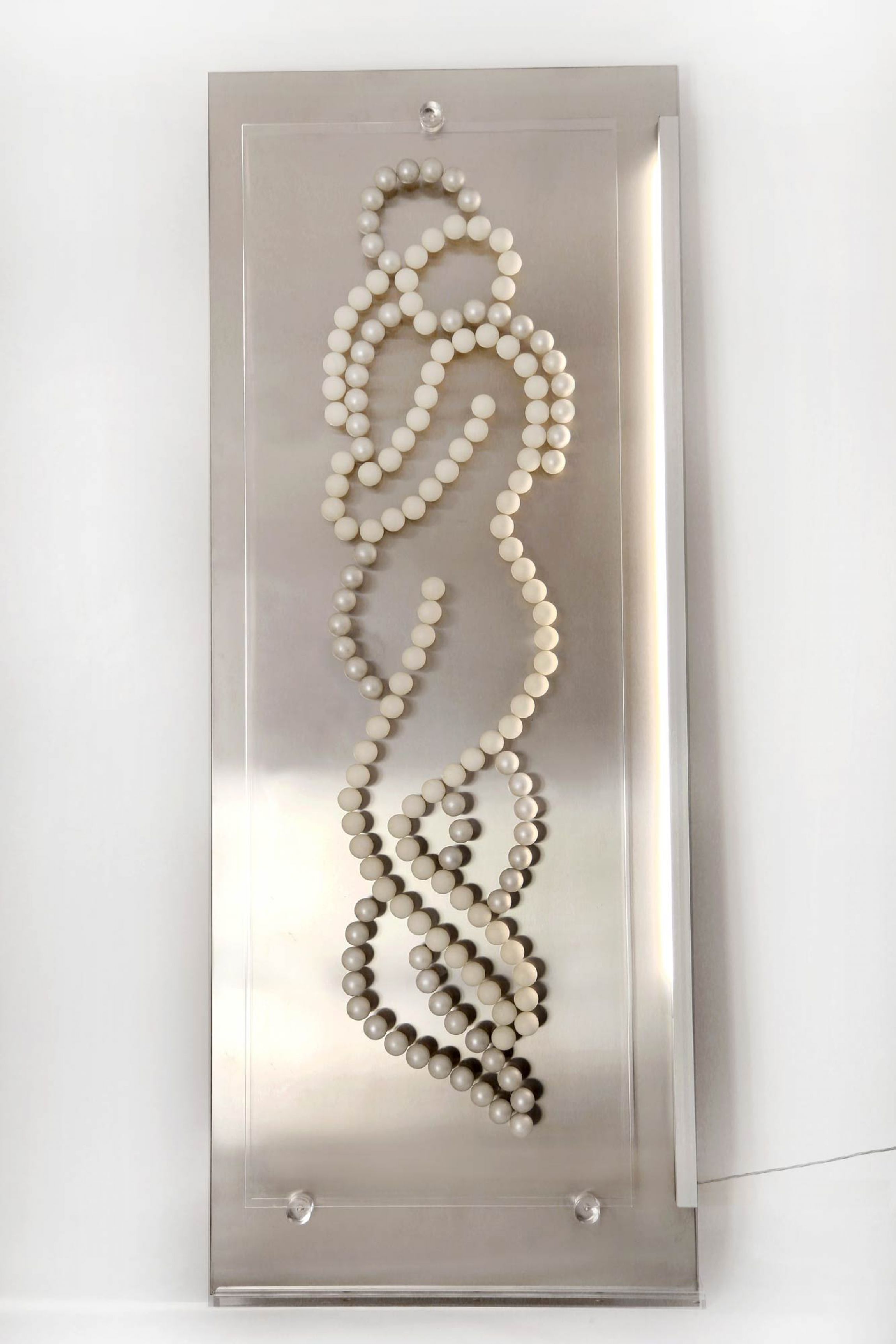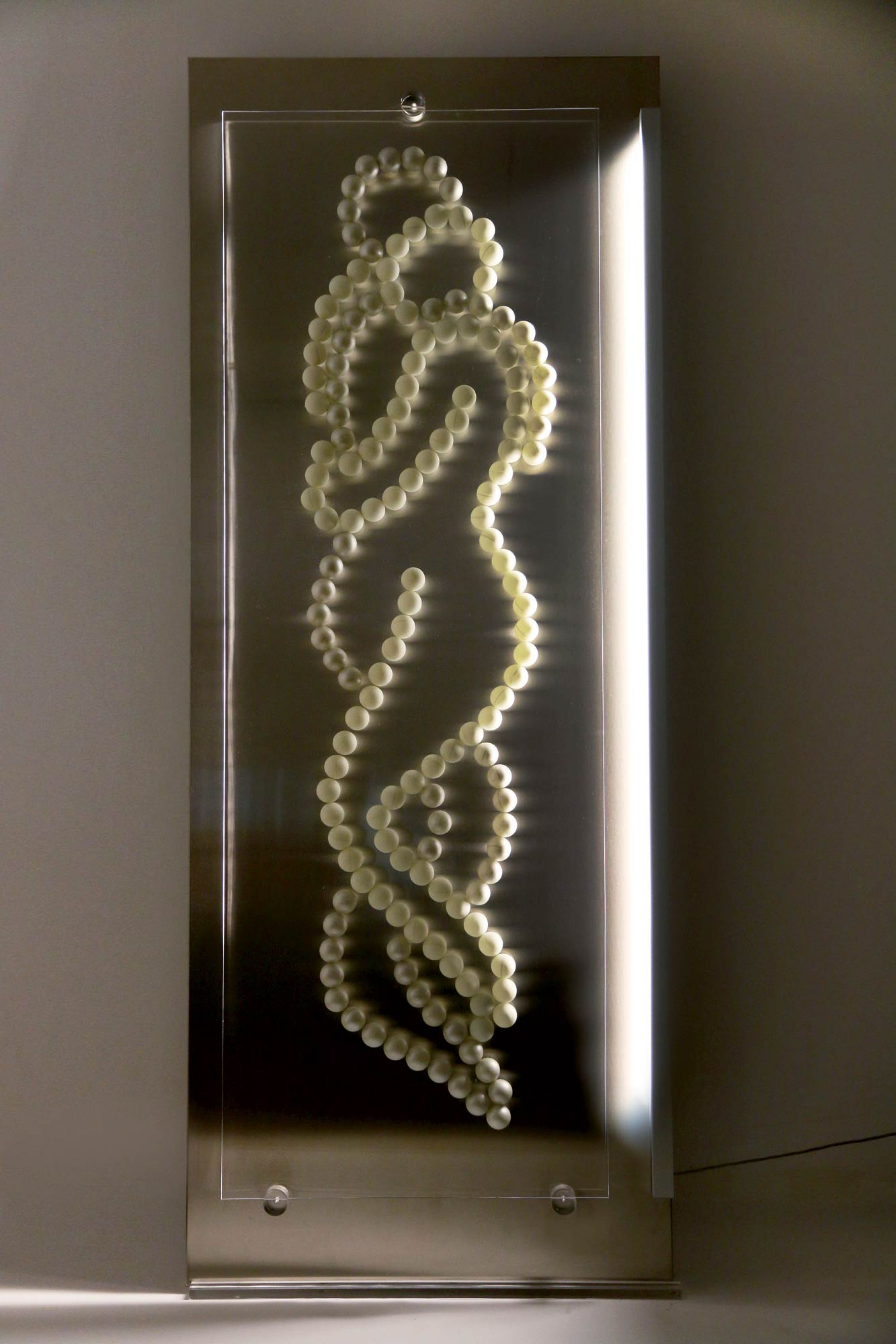 Sculpture and light – two hugging figures, everlasting lovers represented by the lightness of the materials and placed on a transparent panel, detached from all earthly complications.