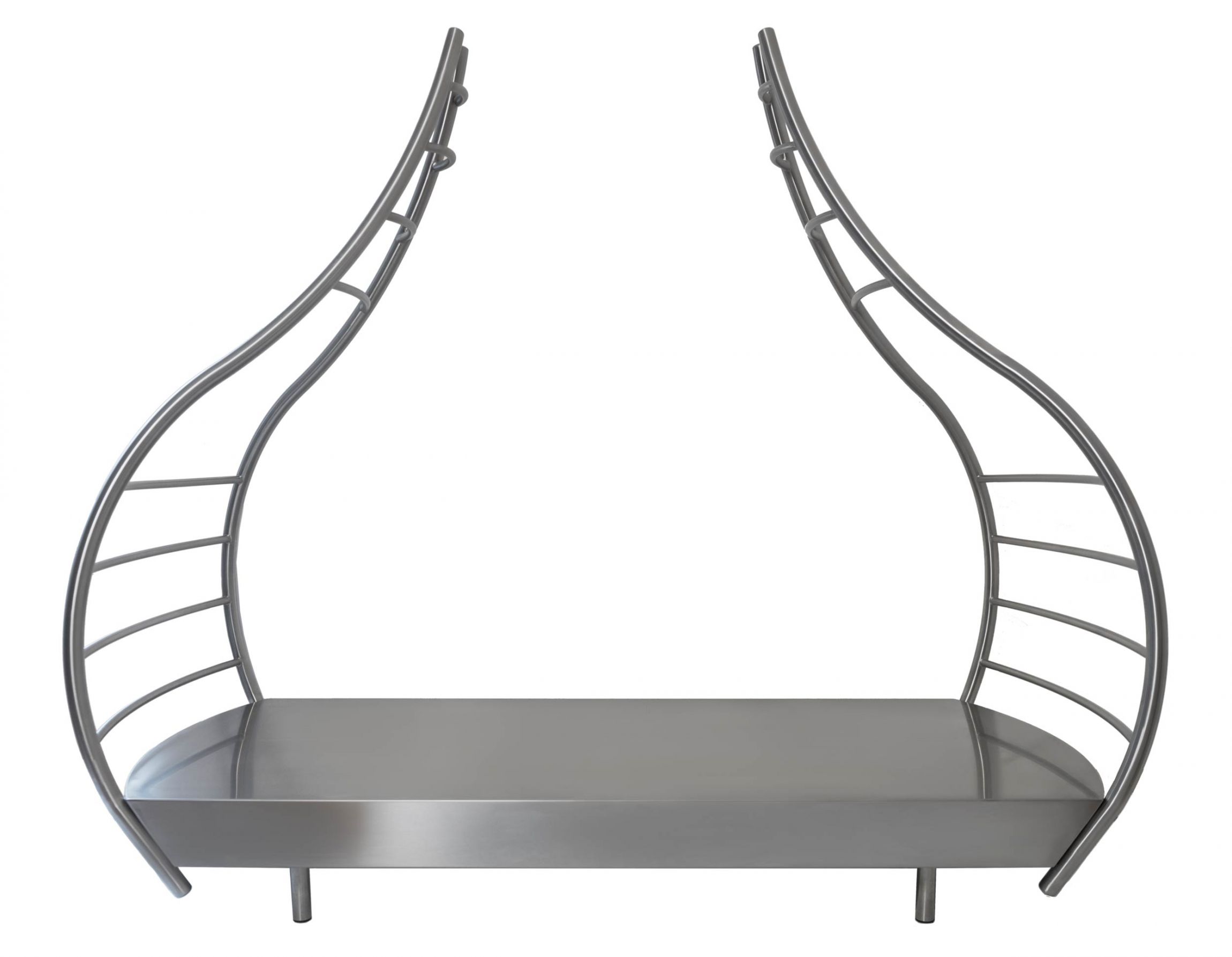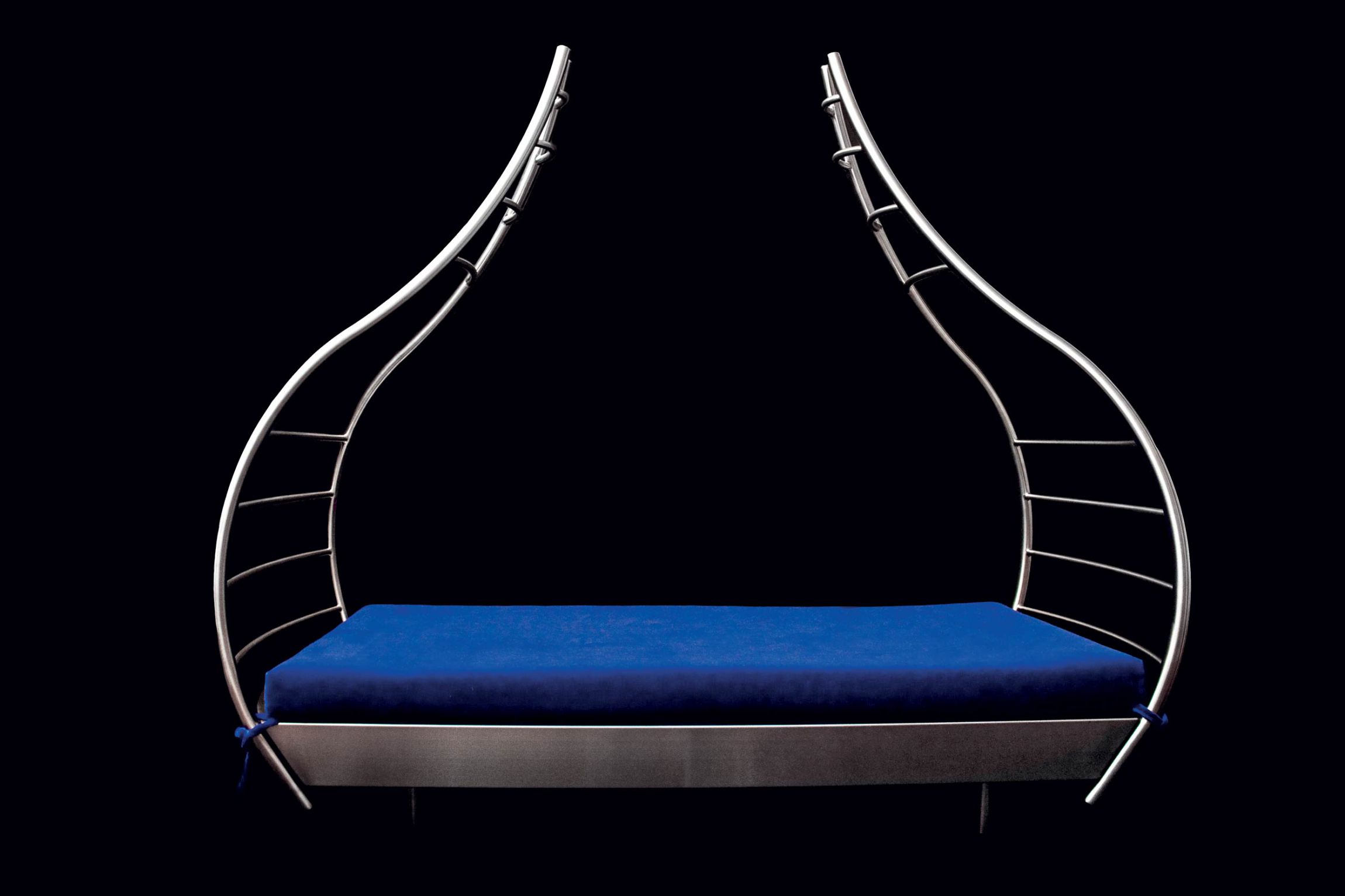 A sculptural bench, daybed and chaise longue for two people (the two side wings can be used as back rest), masterfully hand-crafted in curved stainless steel that contrasts with the comfortable mattress.